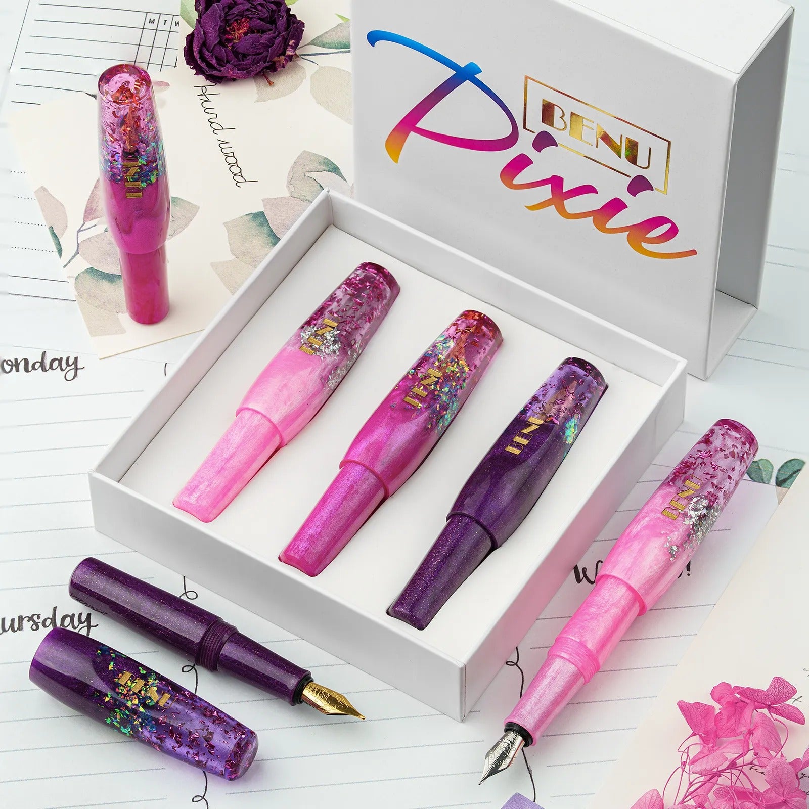 The Magenta Madness set offers maximum flexibility in one bold, shimmering package. Whether you want precision, everyday smoothness, or dramatic lines, each pen is ready for a different writing mood. A perfect collectible for Benu fans and a stunning gift for fountain pen lovers.